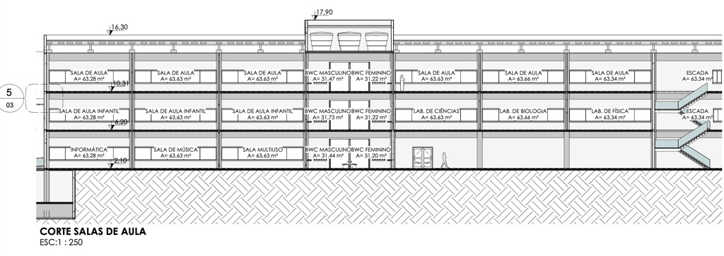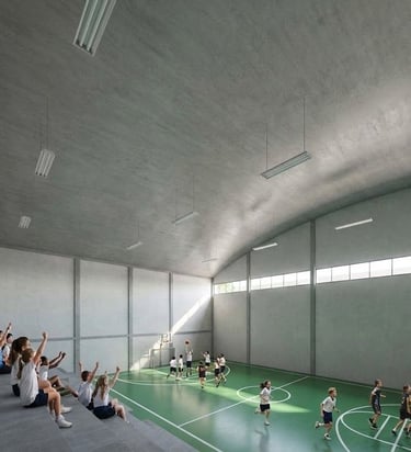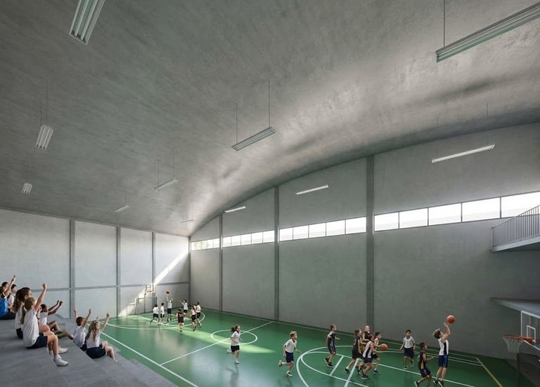 Inspirado na obra e no domínio técnico de Marcos Acayaba, o projeto adota um sistema construtivo híbrido que une resistência e leveza. O concreto armado é utilizado na estrutura principal (fundações, pilares e lajes) para vencer grandes vãos com estabilidade. Em contraponto, a madeira é aplicada em coberturas, passarelas e brises, conferindo conforto térmico, acústico e uma estética acolhedora que reflete a sustentabilidade e a inovação tecnológica da escola.
