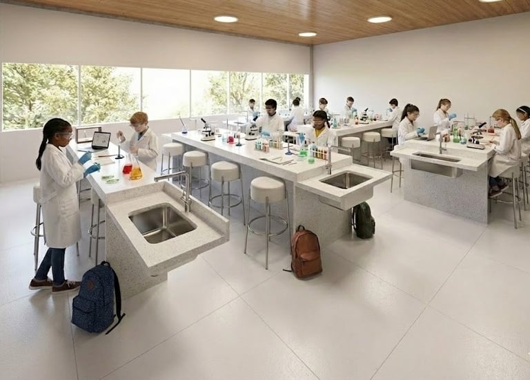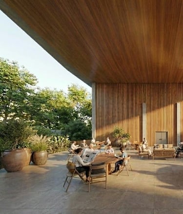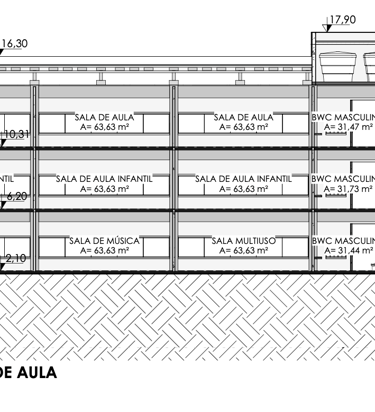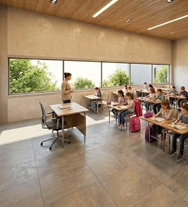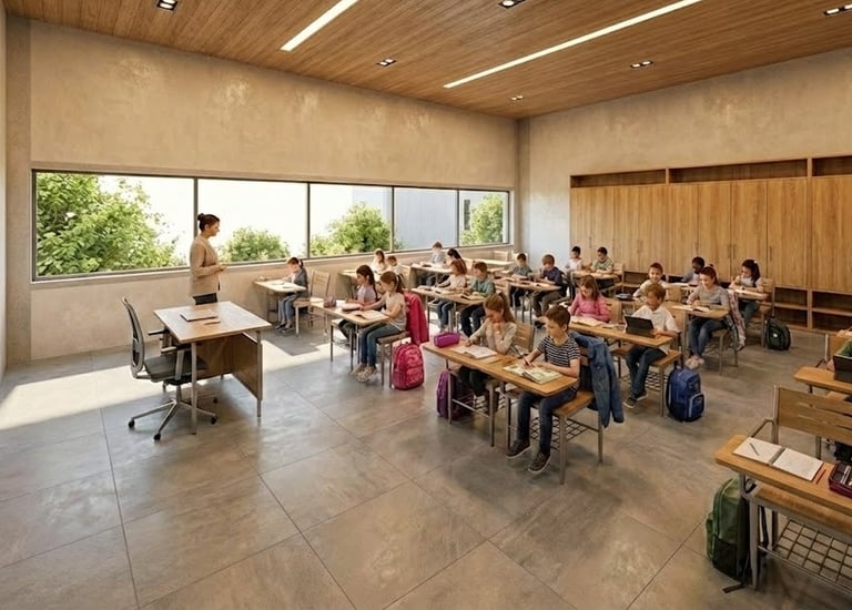 As salas de aula foram concebidas como o "coração pulsante" da escola, posicionadas no centro da edificação para garantir proteção acústica e integração visual. Rompendo com o modelo tradicional de confinamento, cada sala atua como um pavilhão permeável: grandes panos de vidro, protegidos por brises de madeira, permitem a entrada abundante de luz natural e a conexão direta com os pátios internos vegetados.